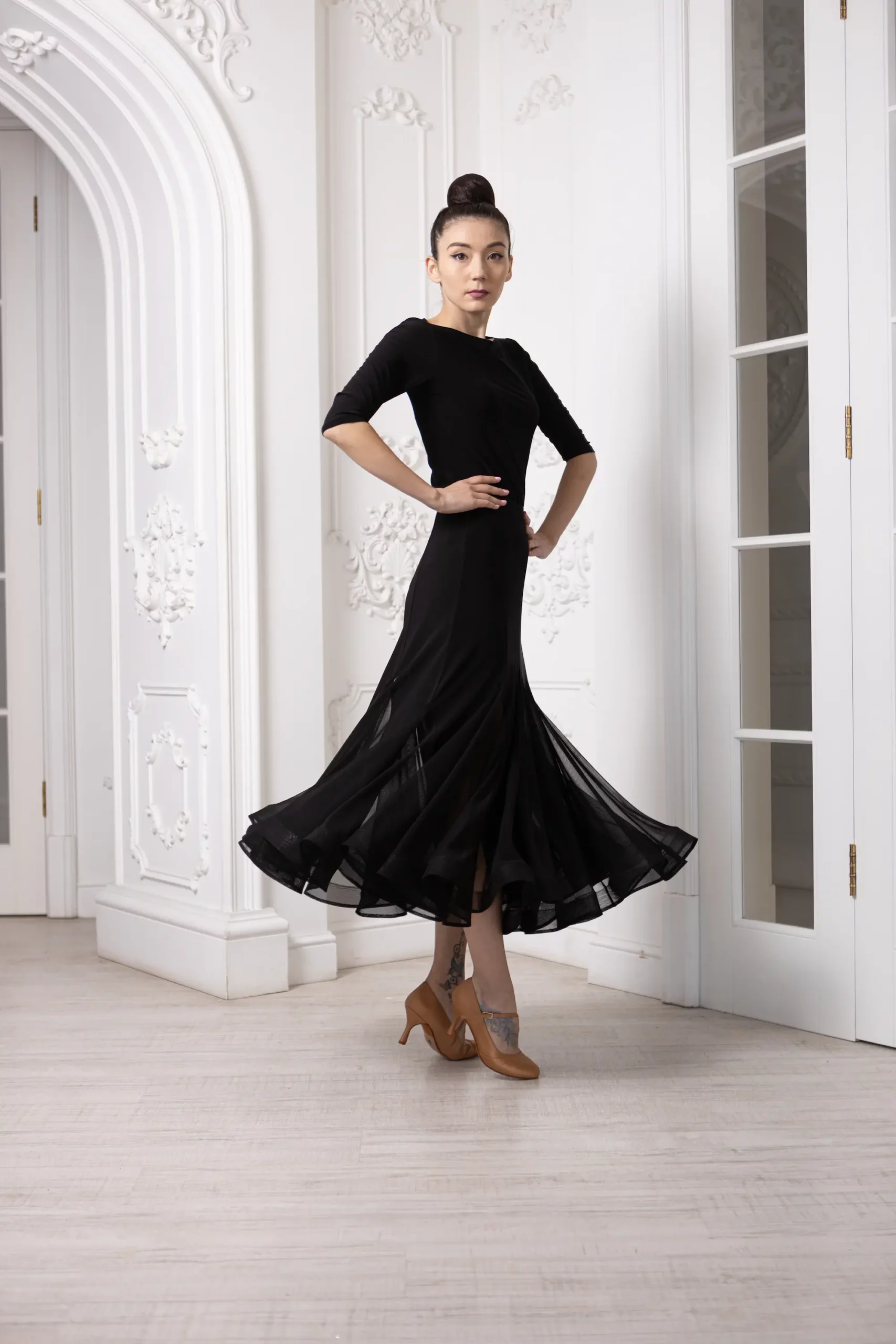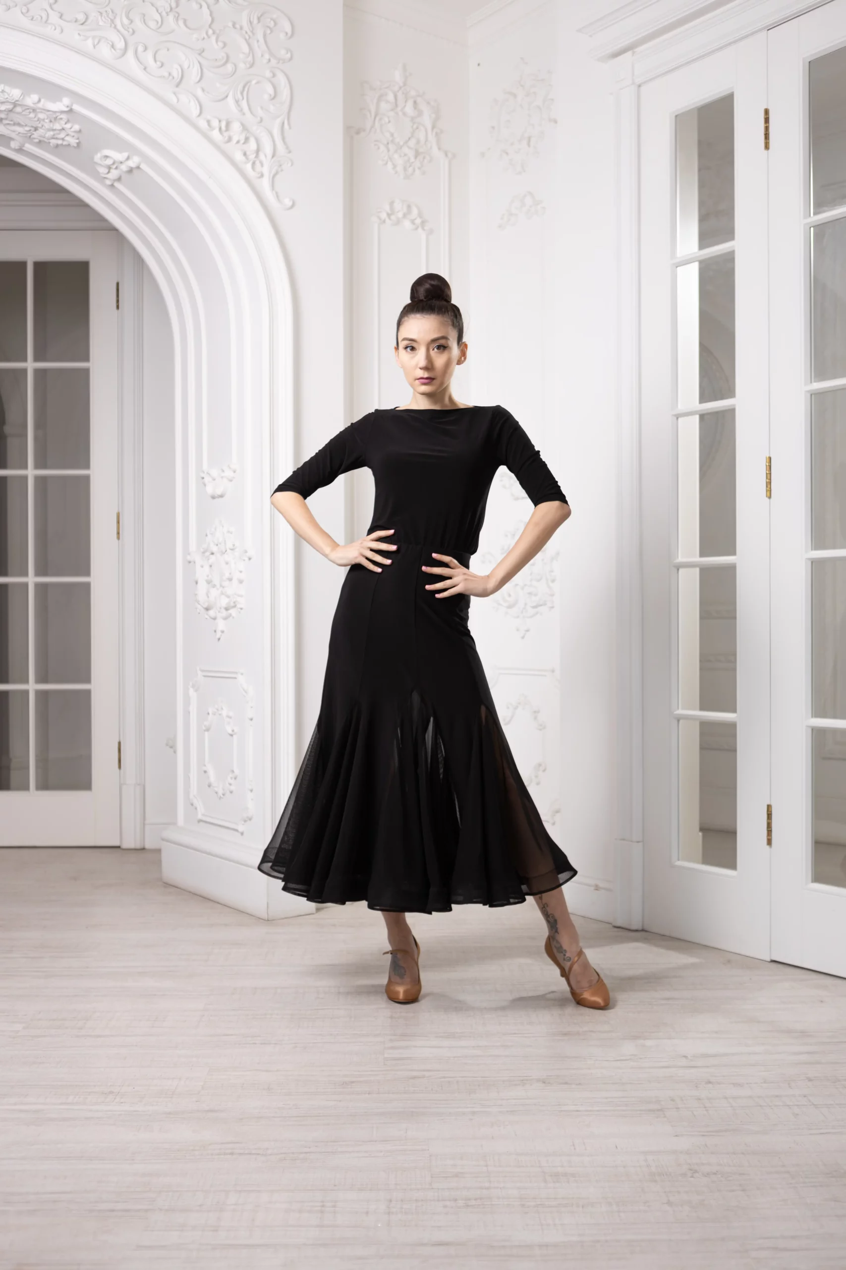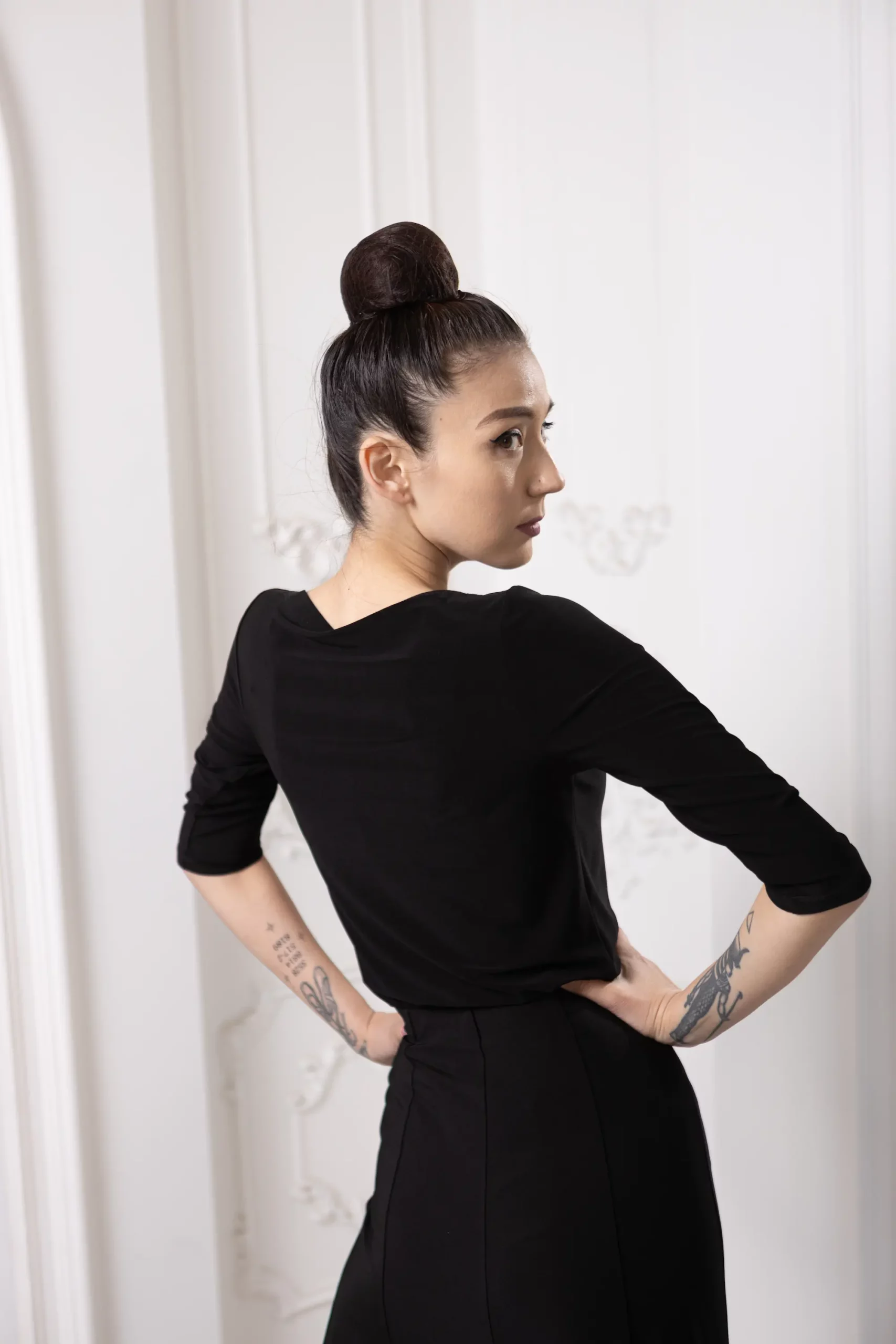 Модель має зручний рукав 3/4 та акуратний виріз горловини, що підкреслює лінію плечей і створює елегантний силует. Завдяки еластичному трикотажу блуза м’яко прилягає до фігури та не обмежує рухи під час танцю.