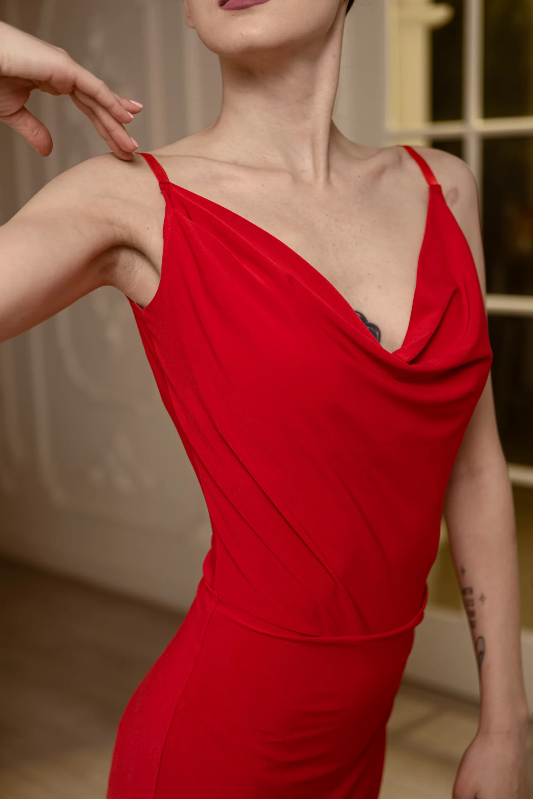 Особливістю моделі є драпіроване декольте на тонких бретелях, яке додає образу жіночності та витонченості. Асиметричний крій спідниці з подовженим елементом створює красиву динаміку під час руху та підкреслює стиль латини.