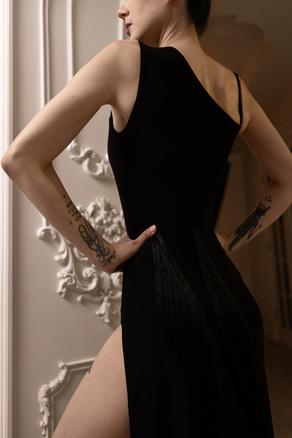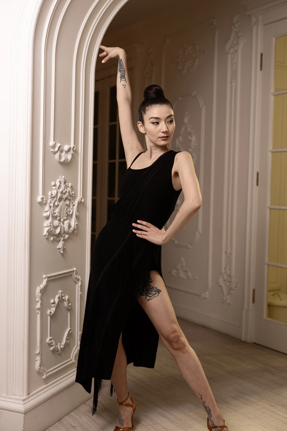 Модель доповнена високим розрізом, який візуально подовжує ноги та забезпечує повну свободу рухів під час танцю. Декоративна бахрома створює динаміку кожного руху, красиво підкреслюючи ритм латини.