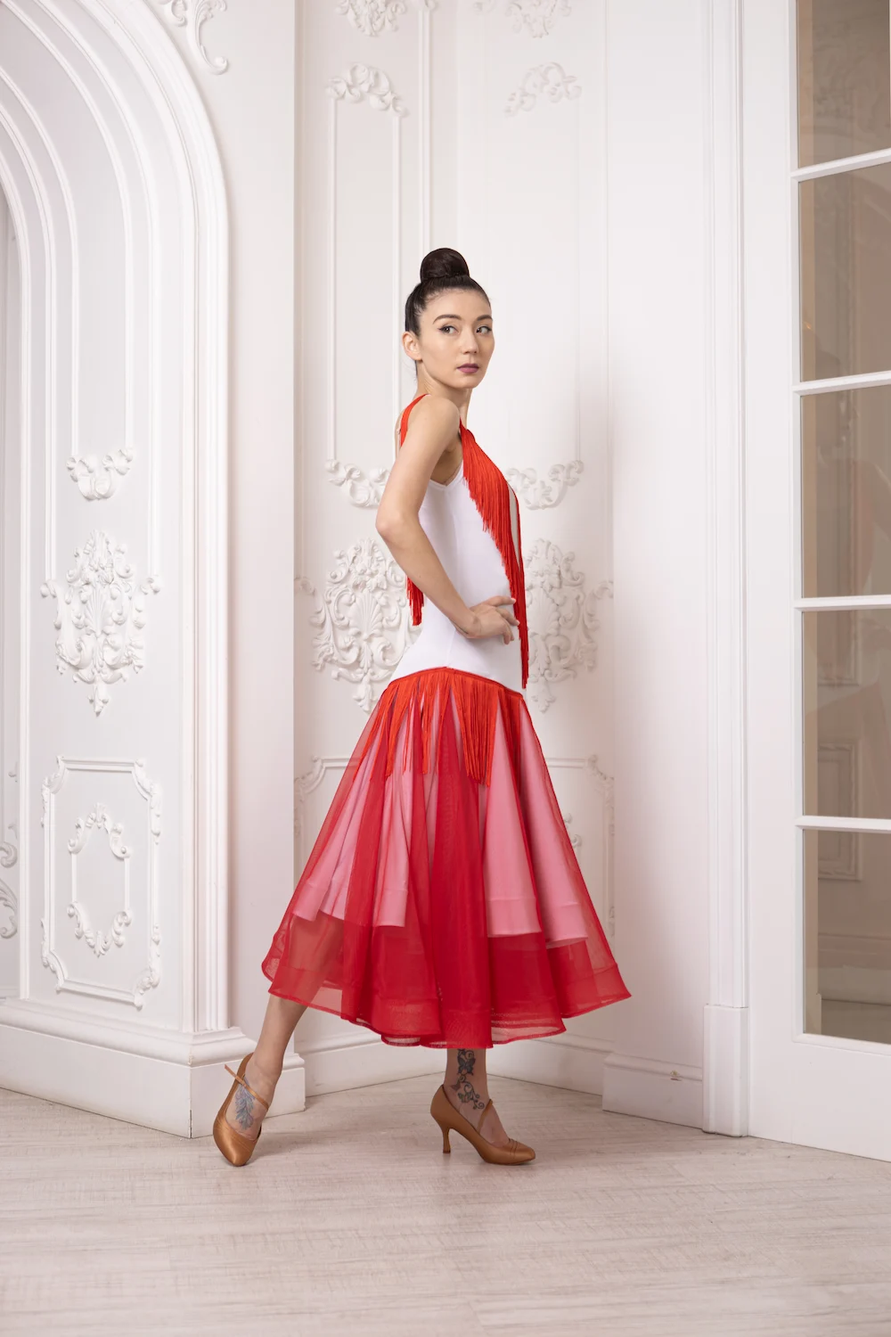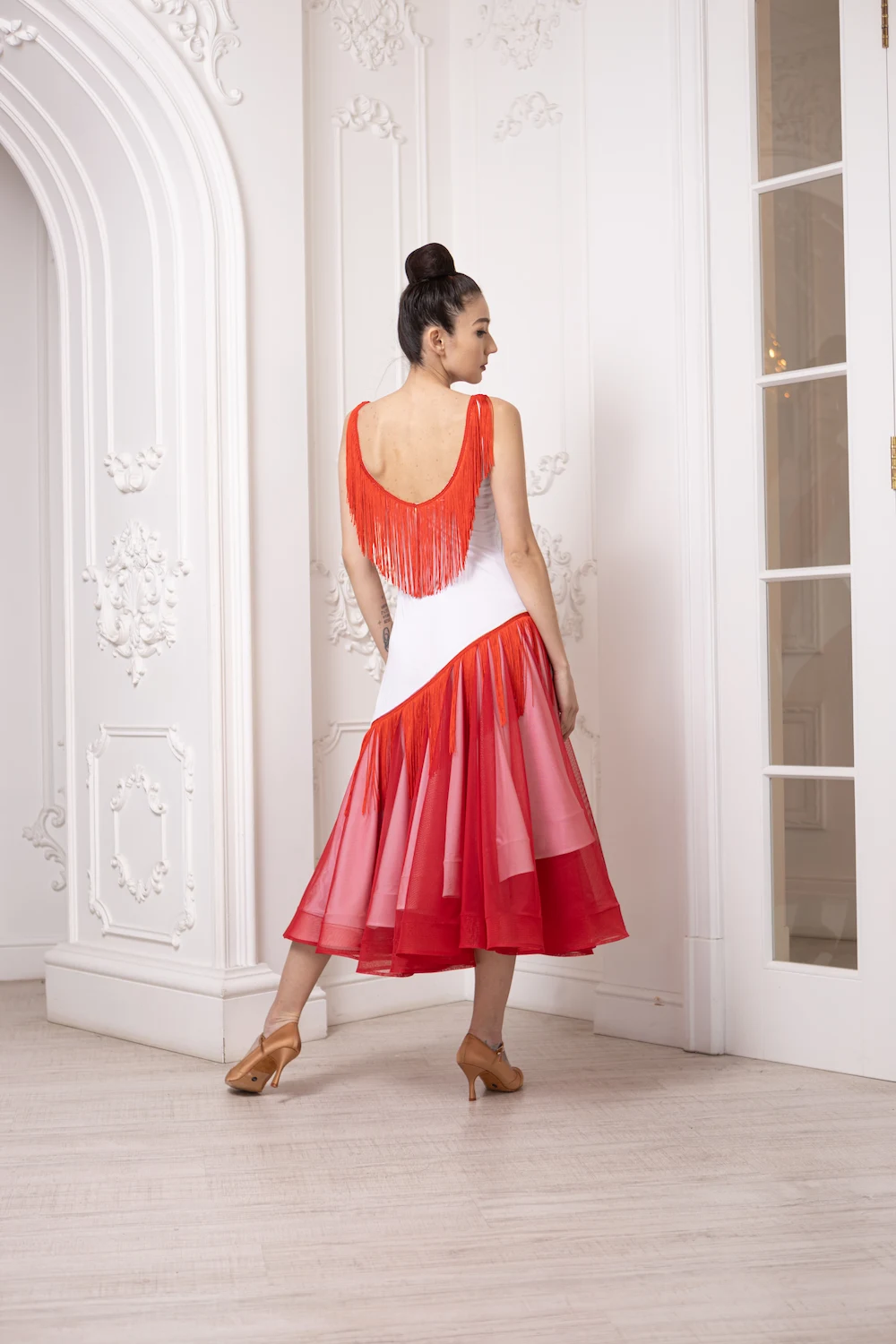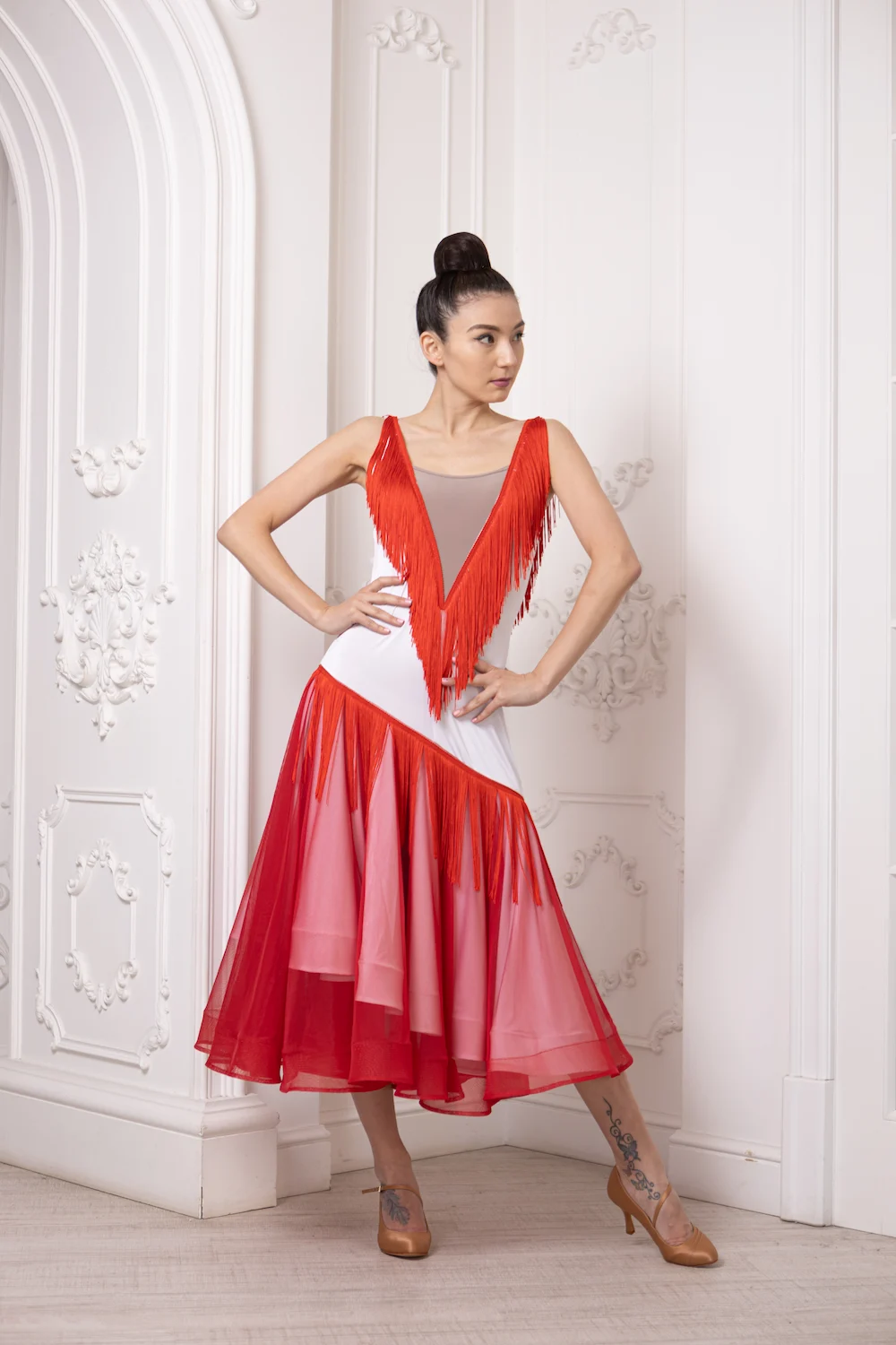 Особливістю моделі є декоративна бахрома у зоні декольте та на спині, яка створює виразну динаміку під час руху та додає образу легкості. Контрастне поєднання кольорів робить сукню помітною та стильною на паркеті.