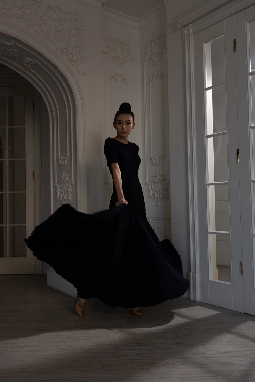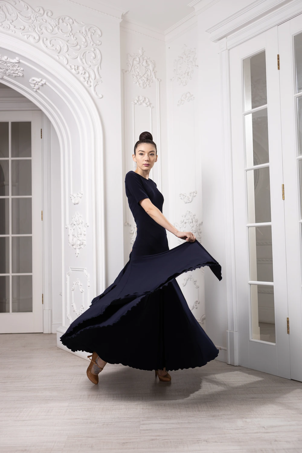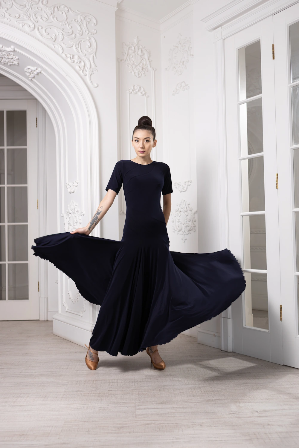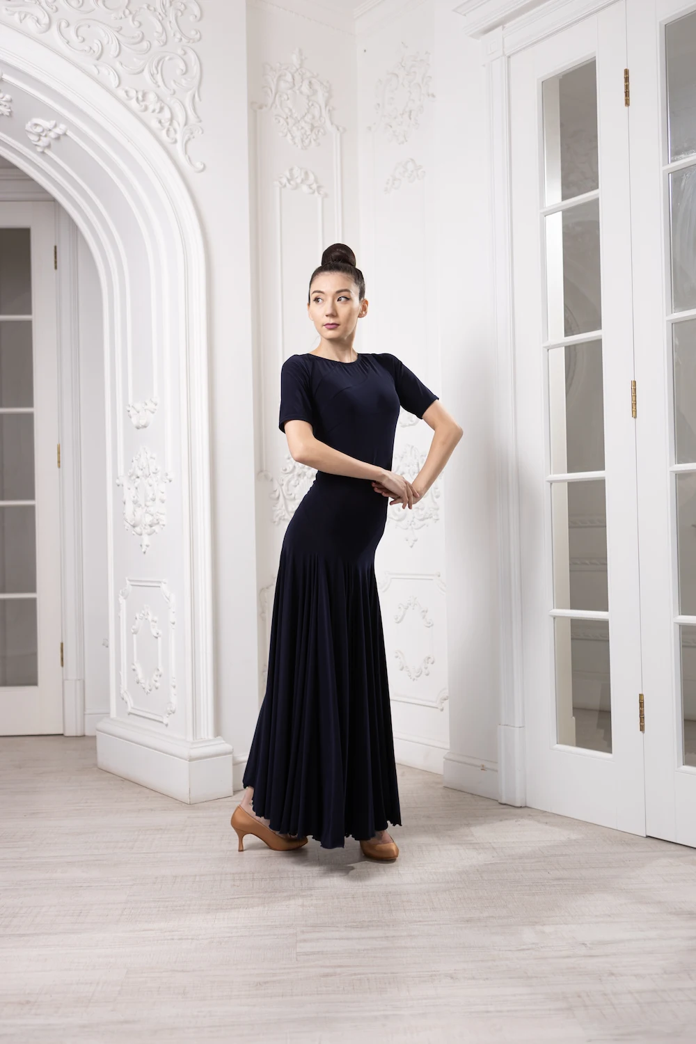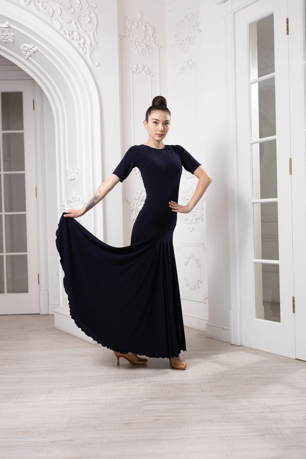 Класичний закритий верх із коротким рукавом підкреслює лінію плечей і робить образ стриманим та професійним, що ідеально підходить для тренувань і виступів у стандартній програмі. Довга спідниця красиво розкривається під час танцю, додаючи легкості та об’єму кожному руху.